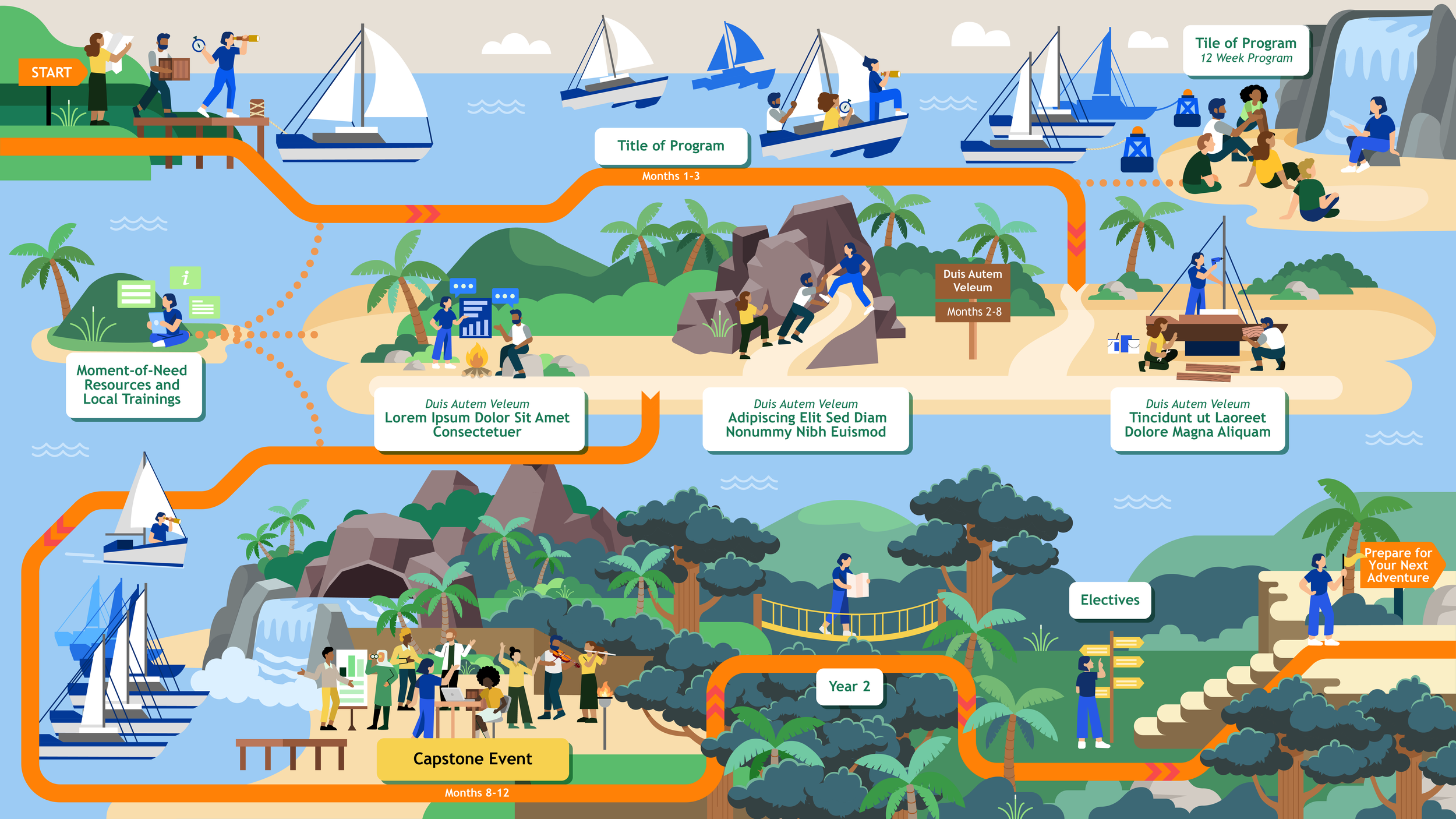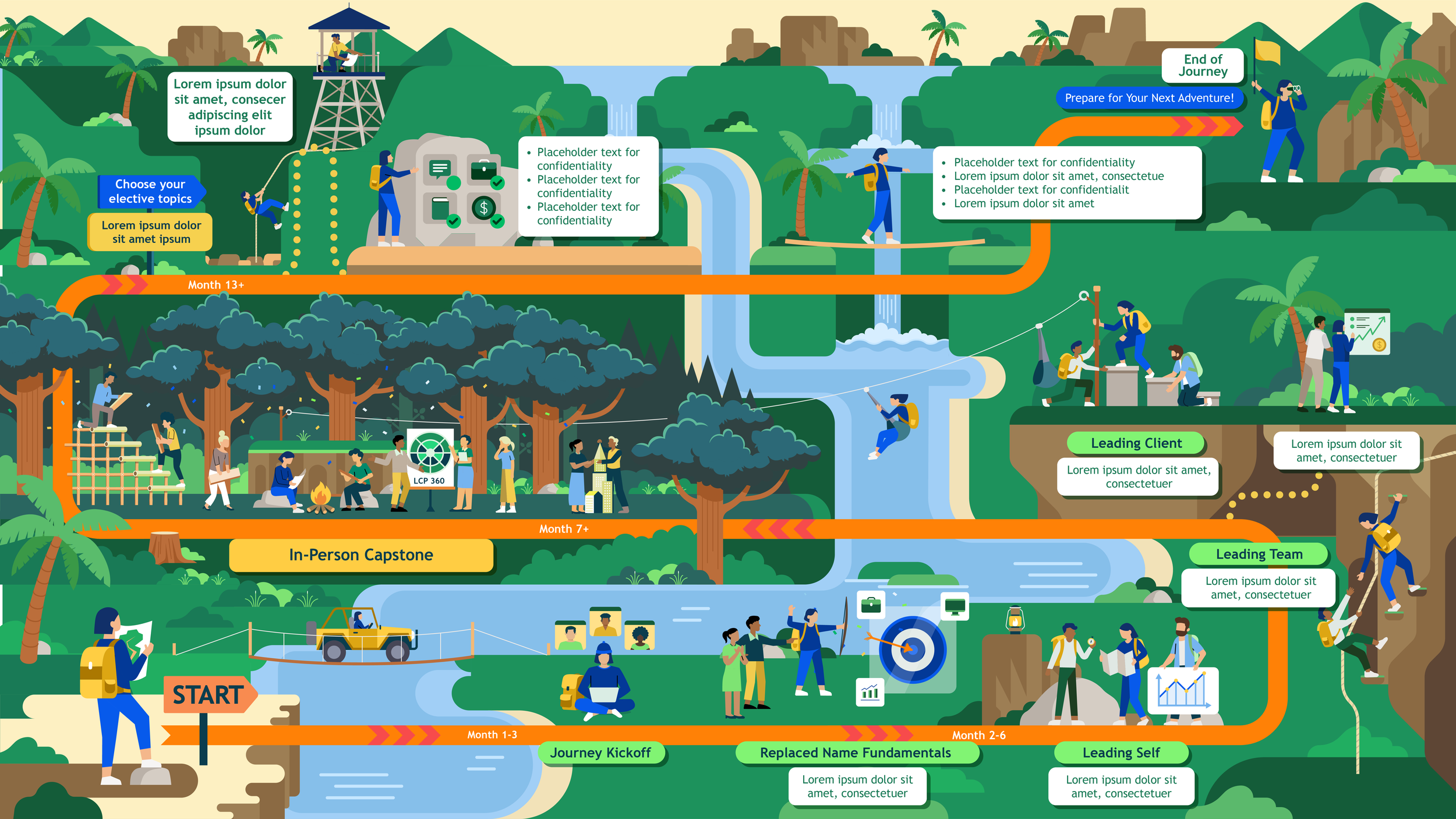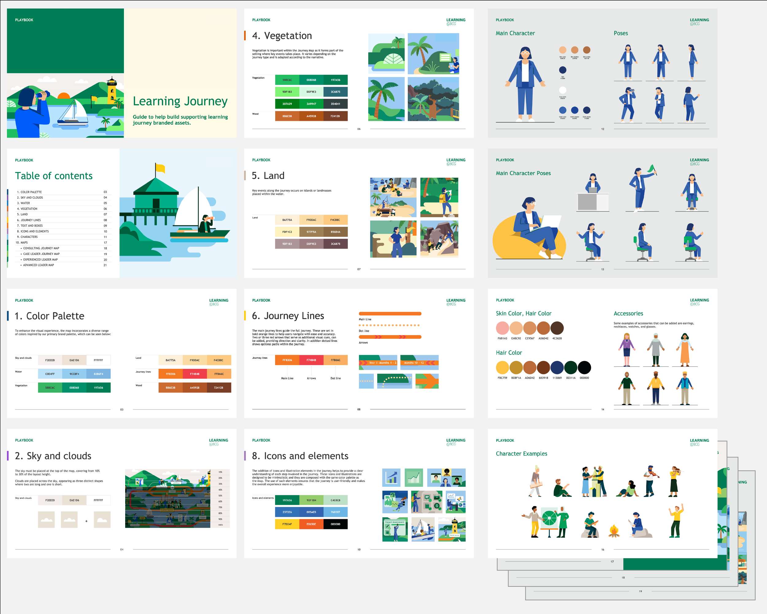 The maps transformed complex information into an engaging storytelling experience, guiding consultants through key milestones in their professional journey. Each cohort—whether Associates, Consultants, or beyond—had a tailored version of the map reflecting its unique development stage, but unified through color, composition, and visual language drawn from the Learning Journeys brand universe.