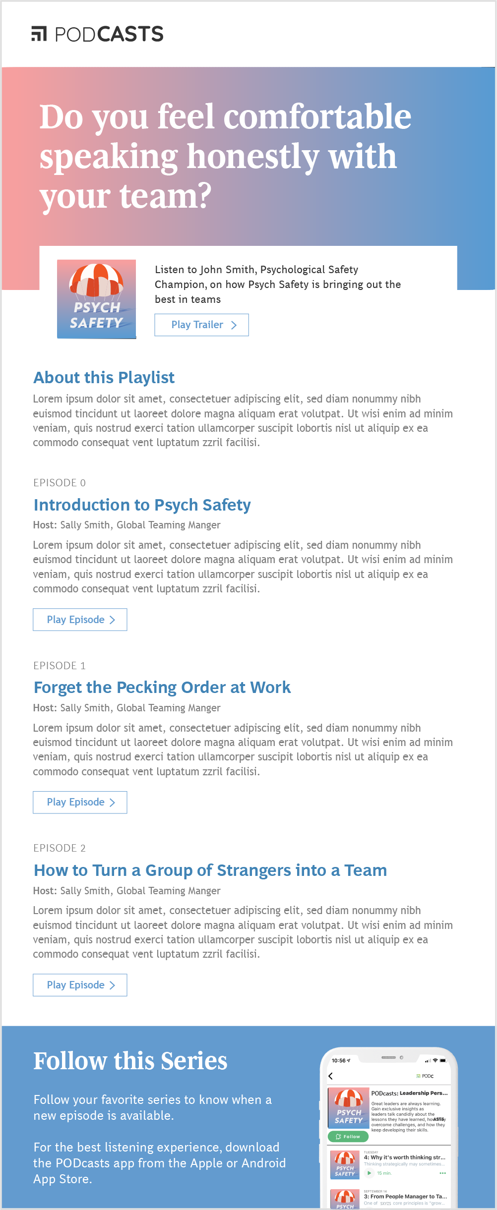 For the Psych Safety podcast, I designed a visual identity that communicates calm, trust, and reassurance. The concept draws inspiration from a parachute—a universal symbol of safety and support—paired with a soothing gradient palette that evokes steadiness and care. The goal was to create a design that feels approachable and uplifting, visually echoing the series’ focus on psychological safety and well-being within teams.
